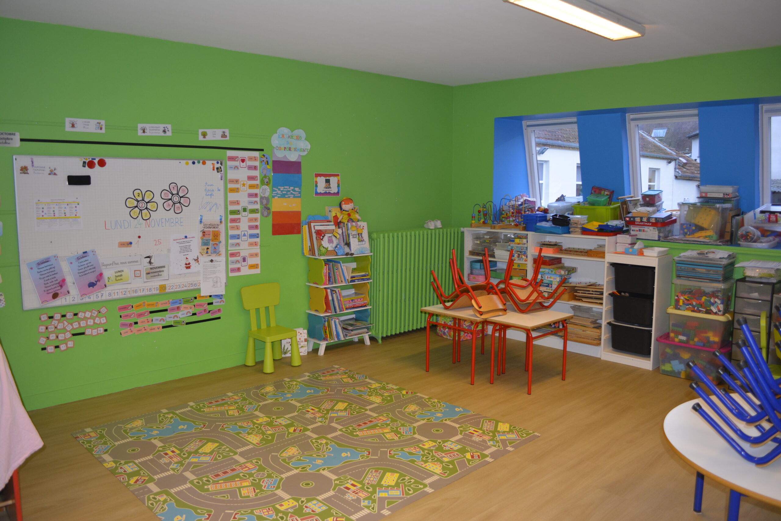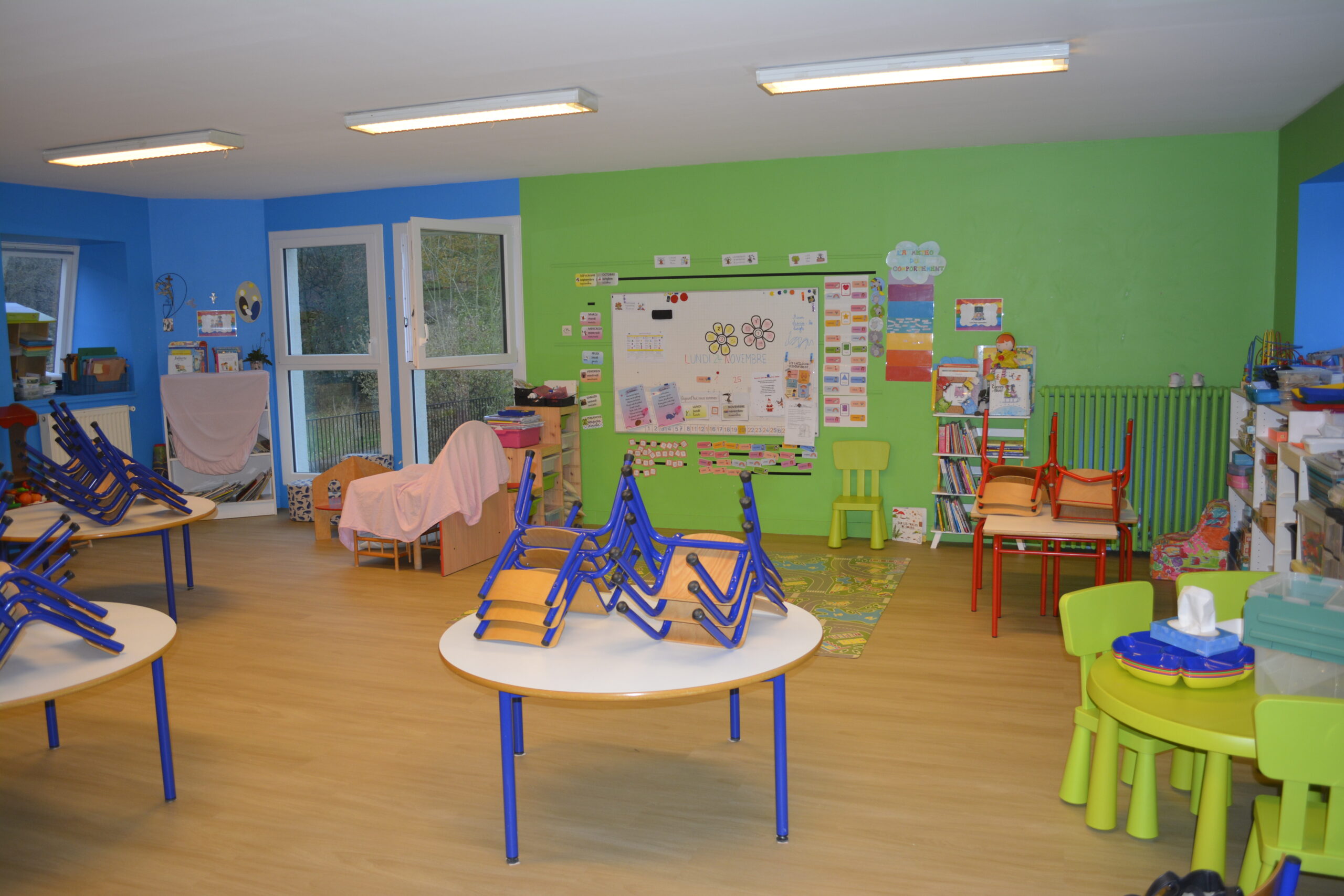 Une cour est goudronnée et les enfants de maternelle peuvent aussi profiter d’une cour gazonnée aux beaux jours. Le bâtiment de la maternelle possède 2 salles de classe, un dortoir et une salle de motricité et d’activités.
